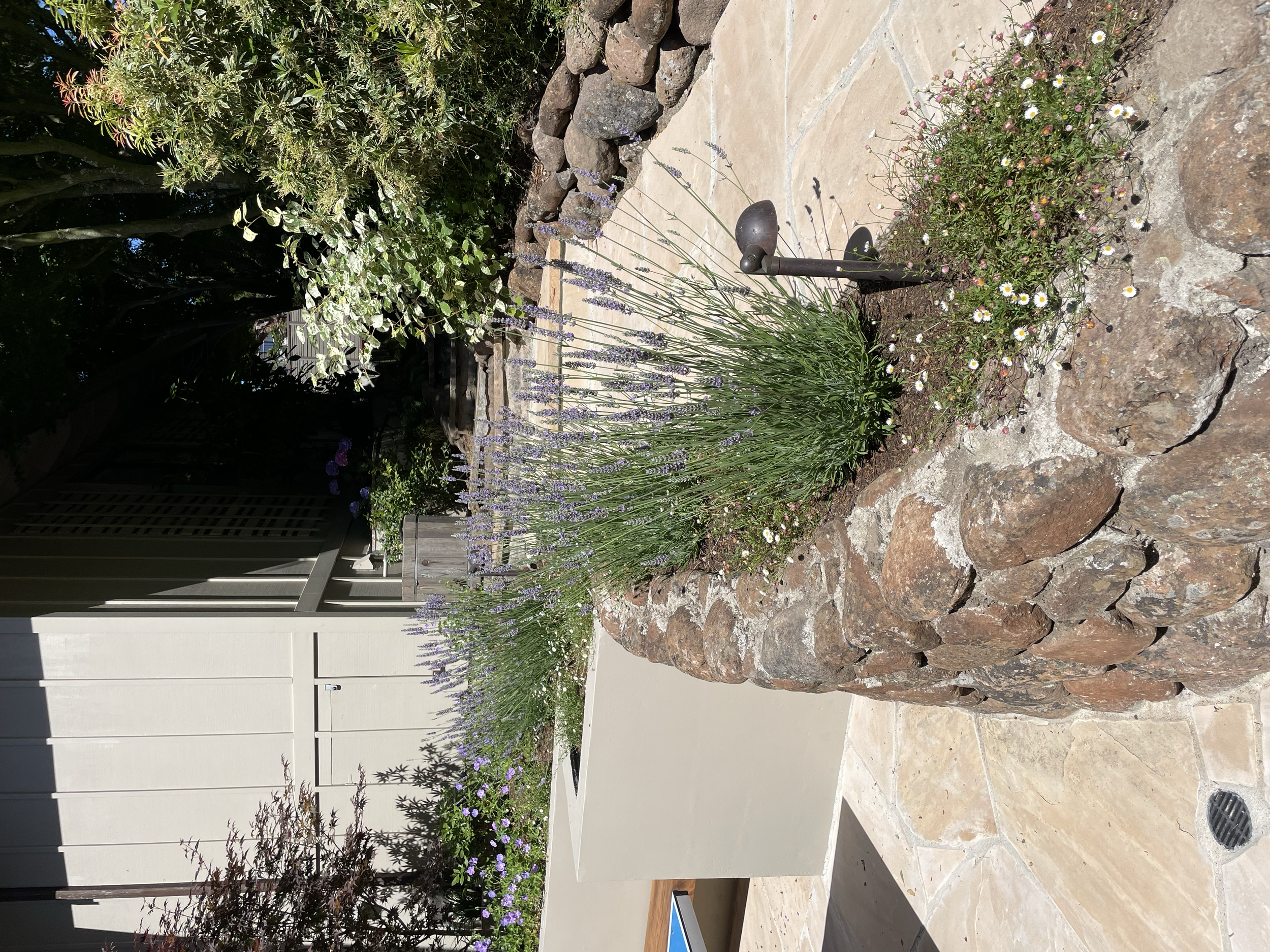 The result is a new nook with a floating Redwood bench (from the tree), a family space perfectly suited for ping-pong, and a half-moon staircase to meet the repaired and widened flagstone pathway leading to the fruit orchard. A blood red Japanese Maple anchors the corner against the house, and a fresh row of lavender invites you to sit and stay awhile.